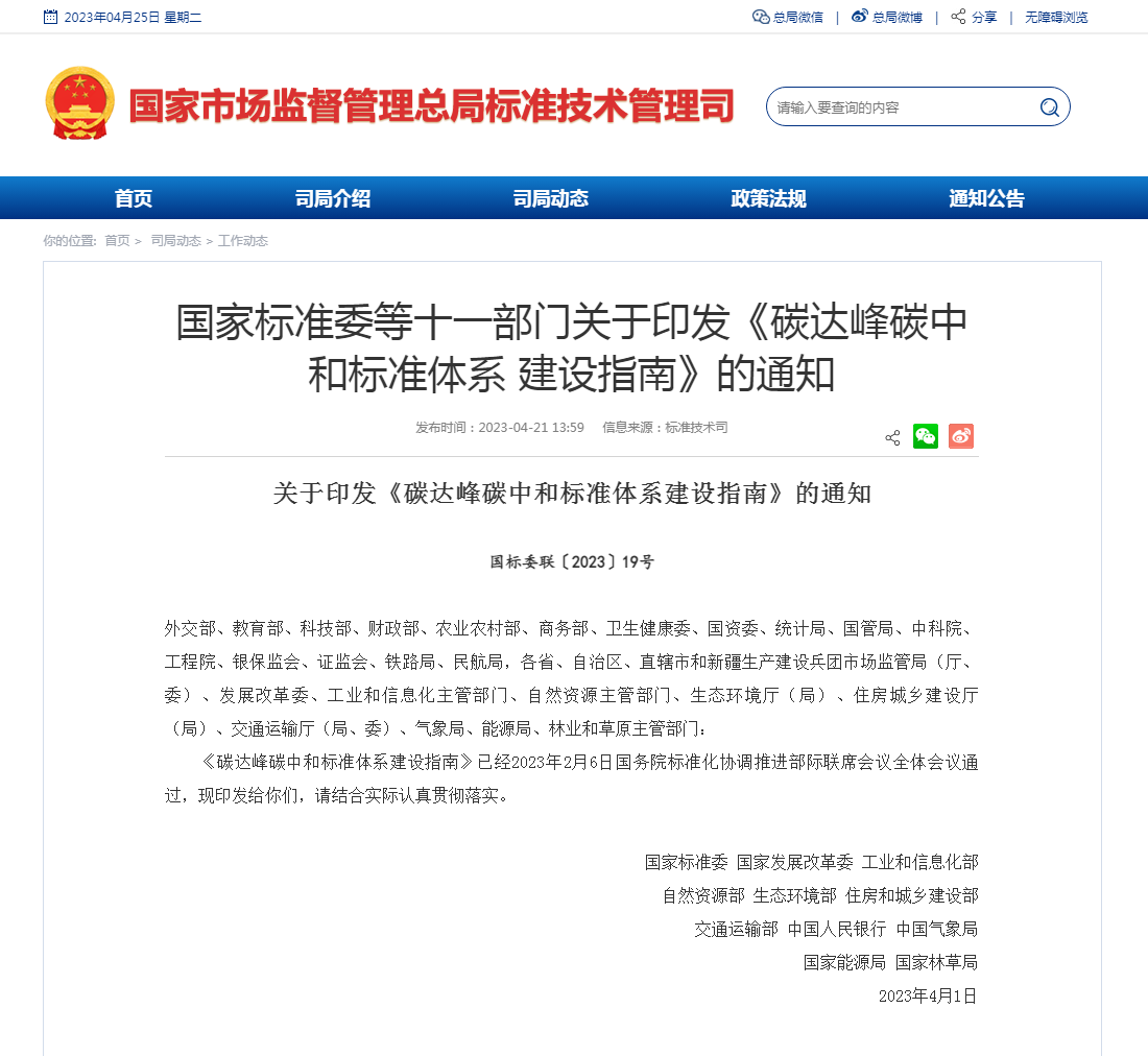 近日,国家标准化管理委员会、国家发展和改革委员会、工业和信息化部等十一部门联合印发《碳达峰碳中和标准体系建设指南》,提出将围绕基础通用标准,以及碳减排、碳清除、碳市场等发展需求,基本建成碳达峰碳中和标准体系。