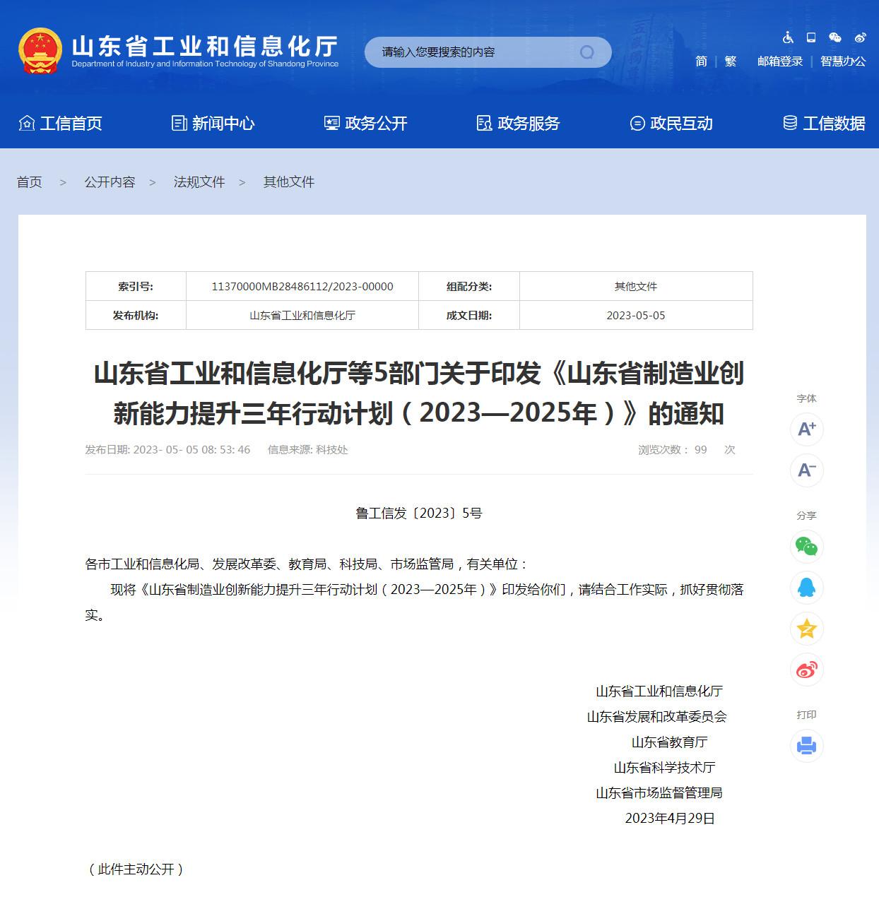 5月5日,山东省工业和信息化厅等5部门正式发布《山东省制造业创新能力提升三年行动计划(2023—2025年)》,山东将实施关键核心技术攻关能力提升行动、科技创新人才队伍提升行动、企业技术创新能力提升行动、优质企业培育提升行动、产业链协同创新能力提升行动、未来产业发展提升行动、“山东制造”品牌提升行动、质量管理建设提升行动、标准引领提升行动等九大行动,加快提升制造业创新能力,打造“山东制造”优势品牌。