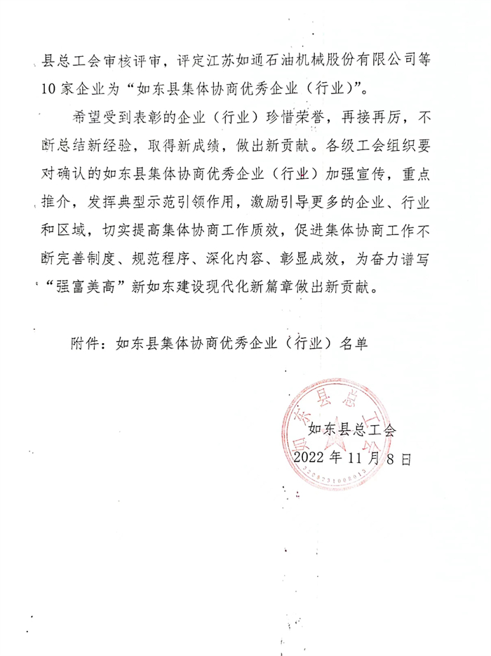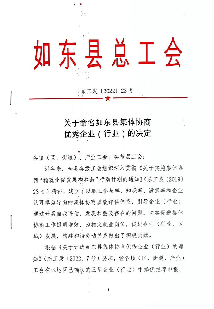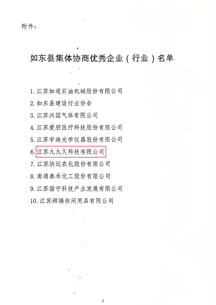 江苏九九久科技荣获“如东县集体协商优秀企业”称号