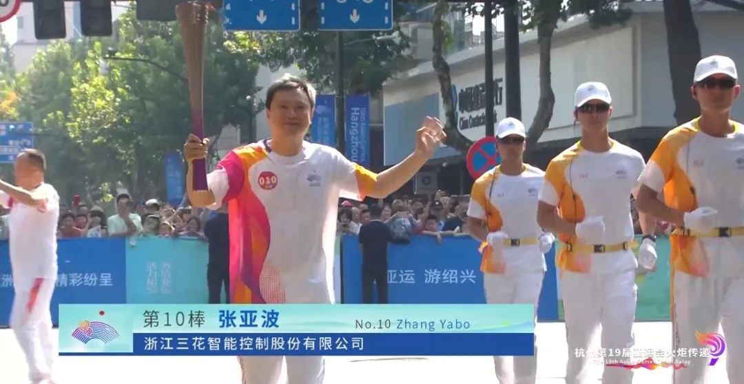 三花控股张亚波副主席担任第10棒火炬手。在交接区,张总举起火炬,从上一棒选手的火炬中接引火种,引燃火炬,然后击掌高举,心手相映,完成极具仪式感的火种传接。在6名护炬手的护卫下,张总边跑边向道路两边热情的观众挥手致意,跑完规定里程,再点燃下一棒选手的火炬。这代表了亚运圣火的接续传递,也代表了人类对奥林匹克精神的追求,薪火相传,生生不息。