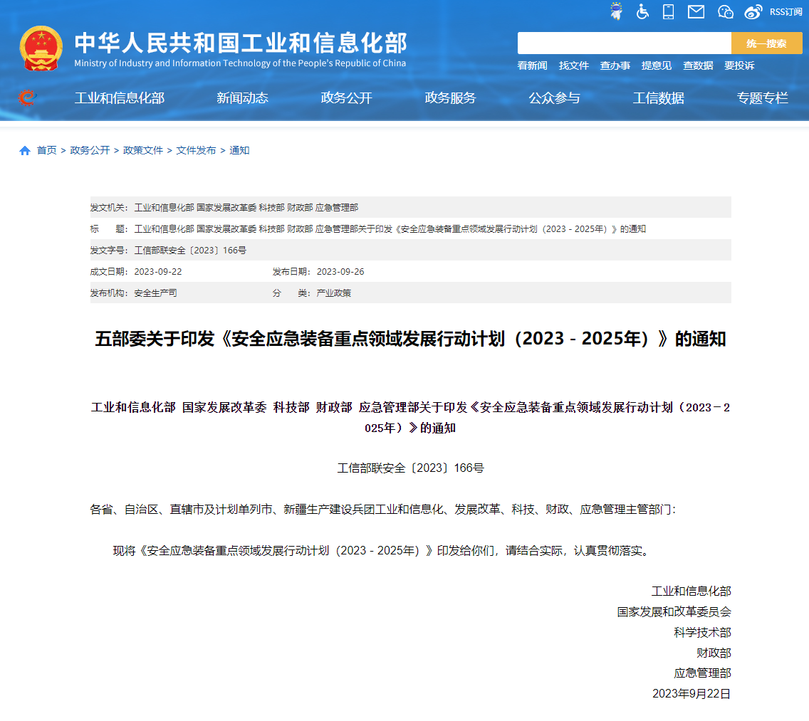 工业和信息化部、国家发展改革委等五部门日前联合印发《安全应急装备重点领域发展行动计划(2023-2025年)》,提出到2025年,安全应急装备产业规模、产品质量、应用深度和广度显著提升,对防灾减灾救灾和重大突发公共事件处置保障的支撑作用明显增强。