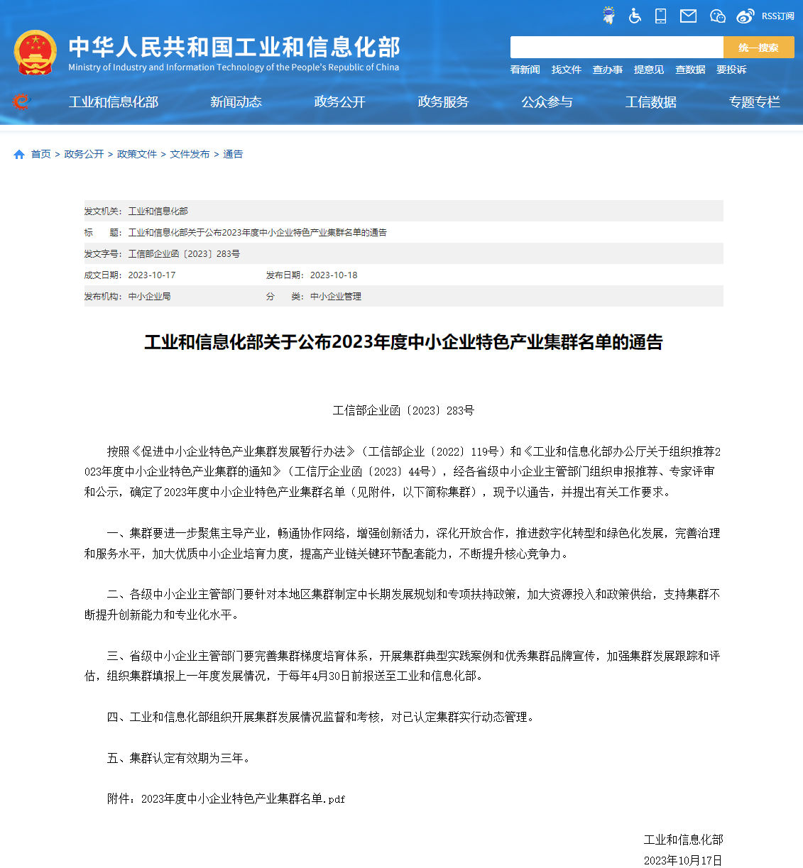 《通告》提出了相关工作要求:一是集群要进一步聚焦主导产业,畅通协作网络,增强创新活力,深化开放合作,推进数字化转型和绿色化发展,完善治理和服务水平,加大优质中小企业培育力度,提高产业链关键环节配套能力,不断提升核心竞争力。二是各级中小企业主管部门要针对本地区集群制定中长期发展规划和专项扶持政策,加大资源投入和政策供给,支持集群不断提升创新能力和专业化水平。三是省级中小企业主管部门要完善集群梯度培育体系,开展集群典型实践案例和优秀集群品牌宣传,加强集群发展跟踪和评估,组织集群填报上一年度发展情况,于每年4月30日前报送至工业和信息化部。四是工业和信息化部组织开展集群发展情况监督和考核,对已认定集群实行动态管理。据悉,集群认定有效期为三年。