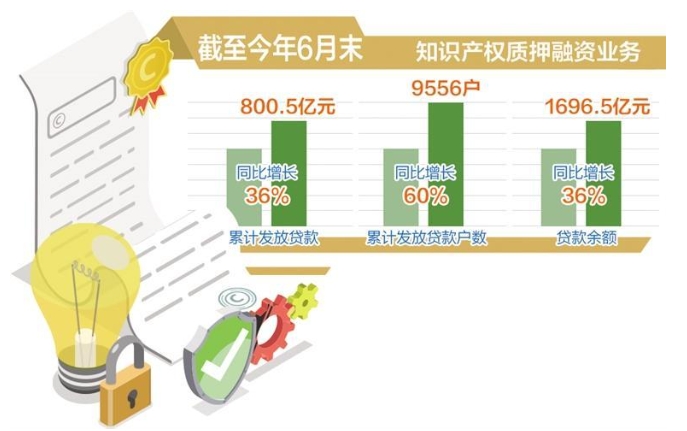 去年底,知识产权质押融资业务首次实现了“千千万”突破,即当年累计发放贷款金额、期末贷款余额双双突破“千亿”关口,全年累计发放贷款户数突破“万户”关口。今年继续保持快速增长,截至6月末,当年累计发放贷款800.5亿元,同比增长36% 当年累计发放贷款户数9556户,同比增长60% 贷款余额1696.5亿元,同比增长36%。