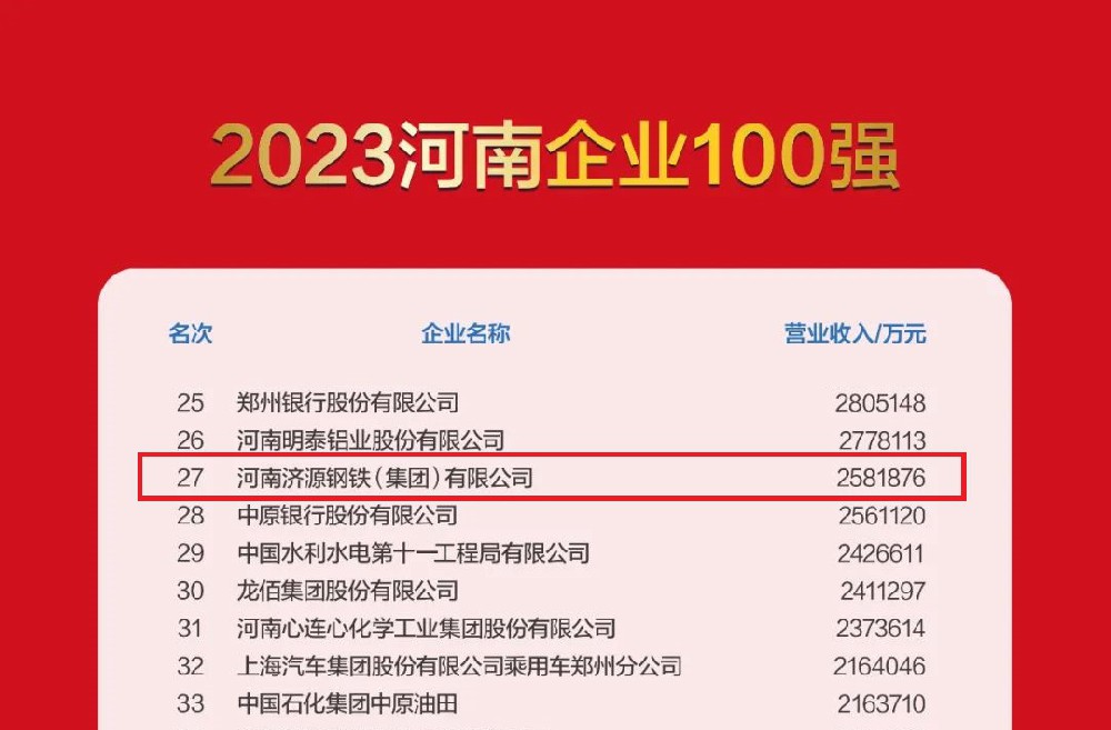 10月27日,2023河南企业100强高峰会在开封开幕,会议主题“振兴河南、大企当先”,现场发布2023河南企业100强榜单、2023河南制造业企业100强榜单、2023河南服务业企业100强榜单、《2023河南企业100强发展报告》,济源钢铁名列2023河南企业100强榜单第27位,2023河南制造业企业100强榜单第16位。