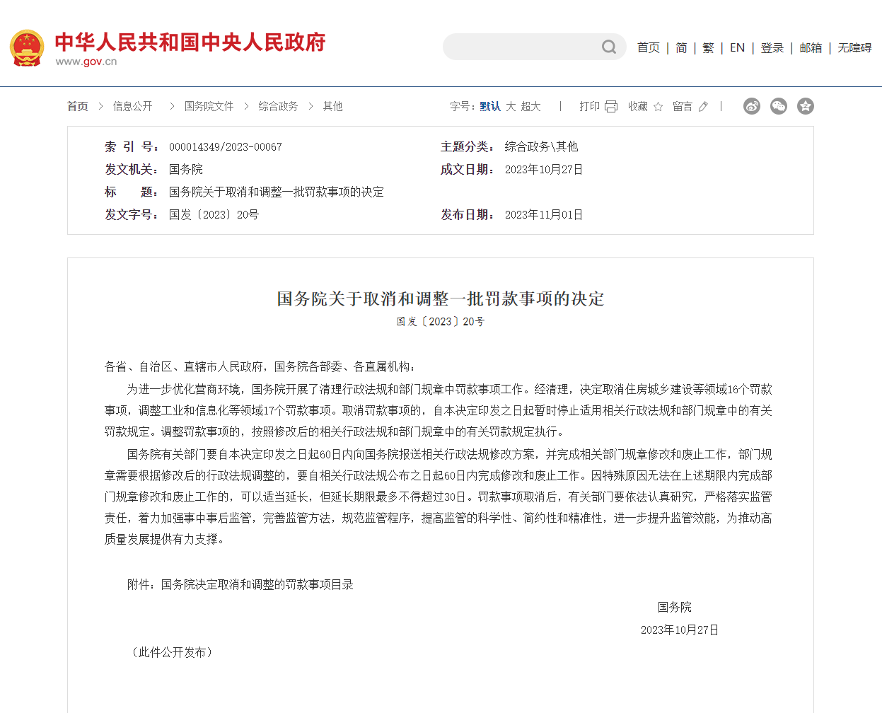 为进一步优化营商环境,国务院日前印发《关于取消和调整一批罚款事项的决定》(以下简称《决定》),取消和调整工业和信息化、住房城乡建设等领域33个罚款事项,其中,取消16个罚款事项,调整17个罚款事项。取消罚款事项的,自《决定》印发之日起暂时停止适用相关行政法规和部门规章中的有关罚款规定 调整罚款事项的,按照修改后的相关行政法规和部门规章中的有关罚款规定执行。