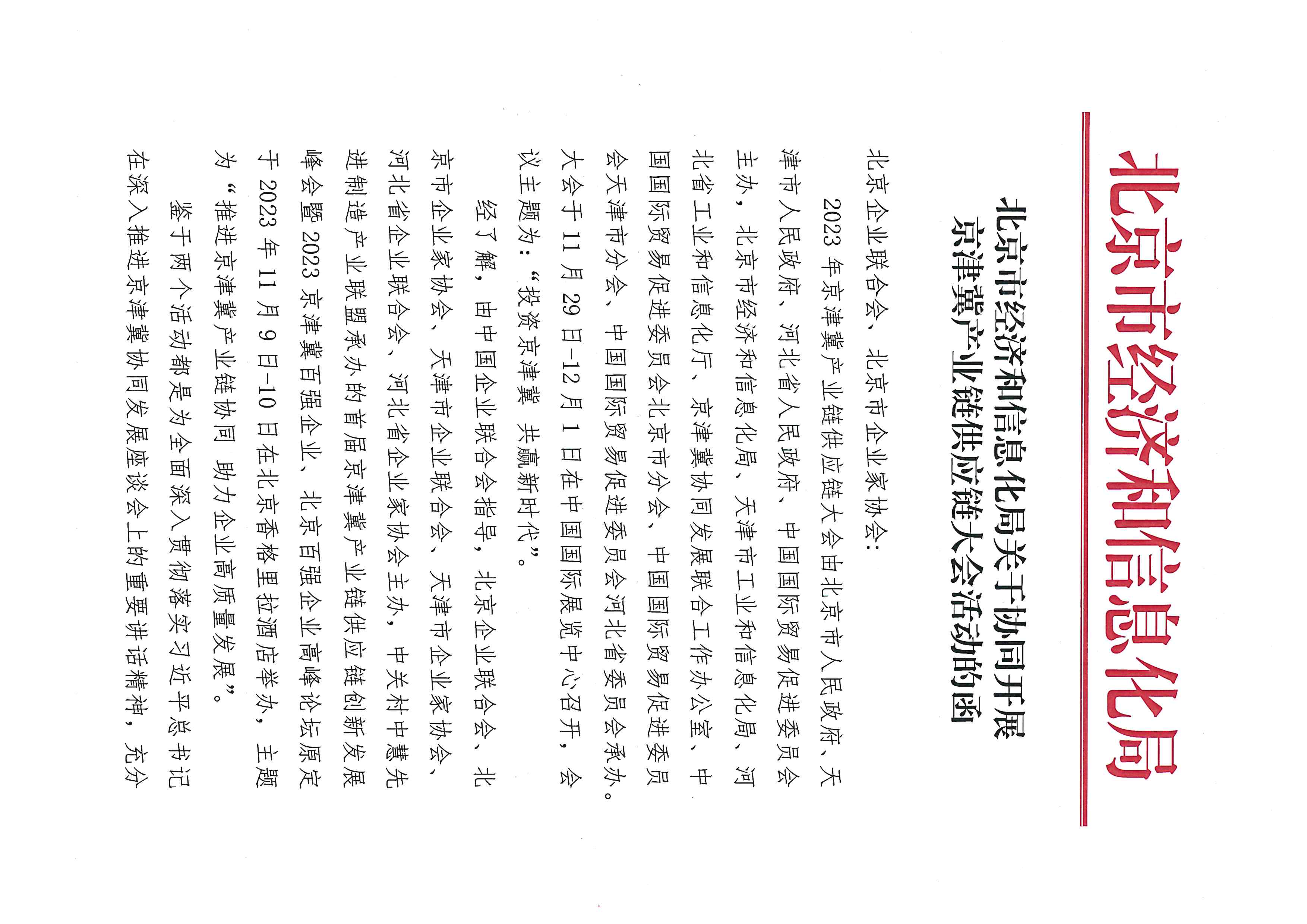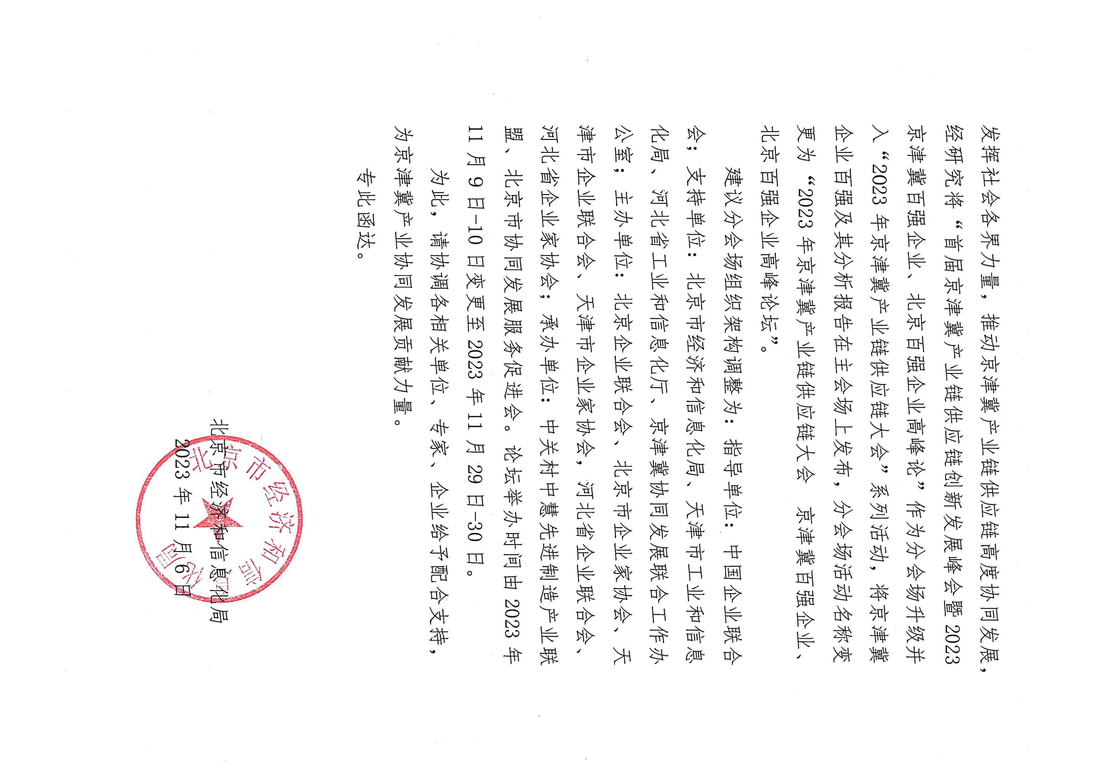 关于变更2023京津冀产业链供应链创新发展峰会暨京津冀百强企业、北京百强企业高峰论坛会议名称和举办时间的通知
