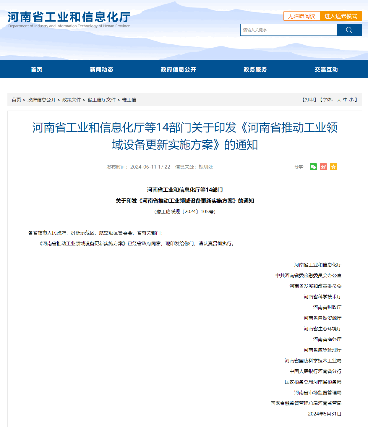 6月11日消息,河南省工业和信息化厅等14部门发布关于印发《河南省推动工业领域设备更新实施方案》的通知。