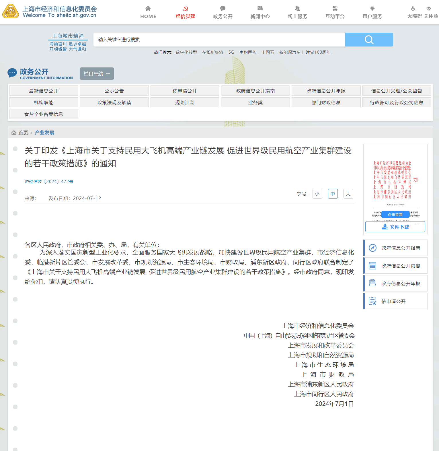 上海市经济和信息化委员会、中国(上海)自由贸易试验区临港新片区管委会、上海市发展和改革委员会等部门近日印发《上海市关于支持民用大飞机高端产业链发展 促进世界级民用航空产业集群建设的若干政策措施》。