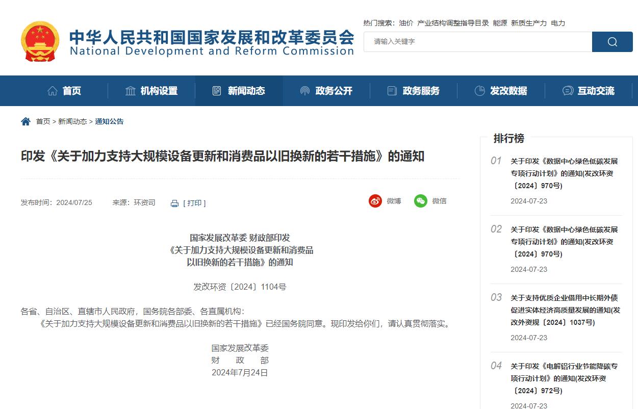 7月25日,国家发展改革委、财政部发布《关于加力支持大规模设备更新和消费品以旧换新的若干措施》。国家统筹安排3000亿元左右超长期特别国债资金,加力支持大规模设备更新和消费品以旧换新,降低超长期特别国债资金申报门槛,不再设置“项目总投资不低于1亿元”要求,支持中小企业设备更新。