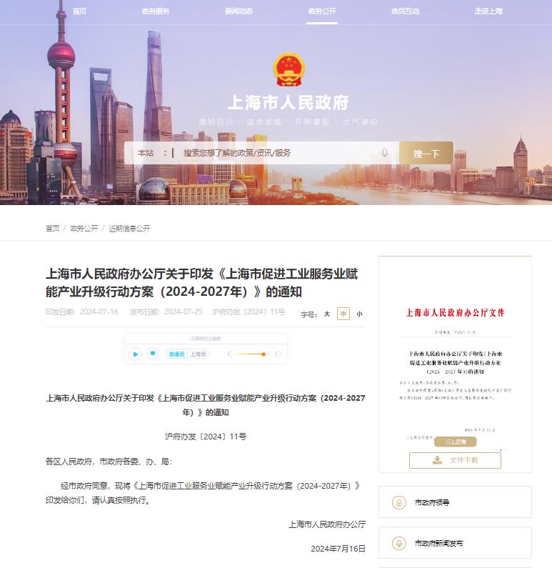 7月25日,上海市政府官网发布《上海市促进工业服务业赋能产业升级行动方案(2024-2027年)》(下称《行动方案》)。