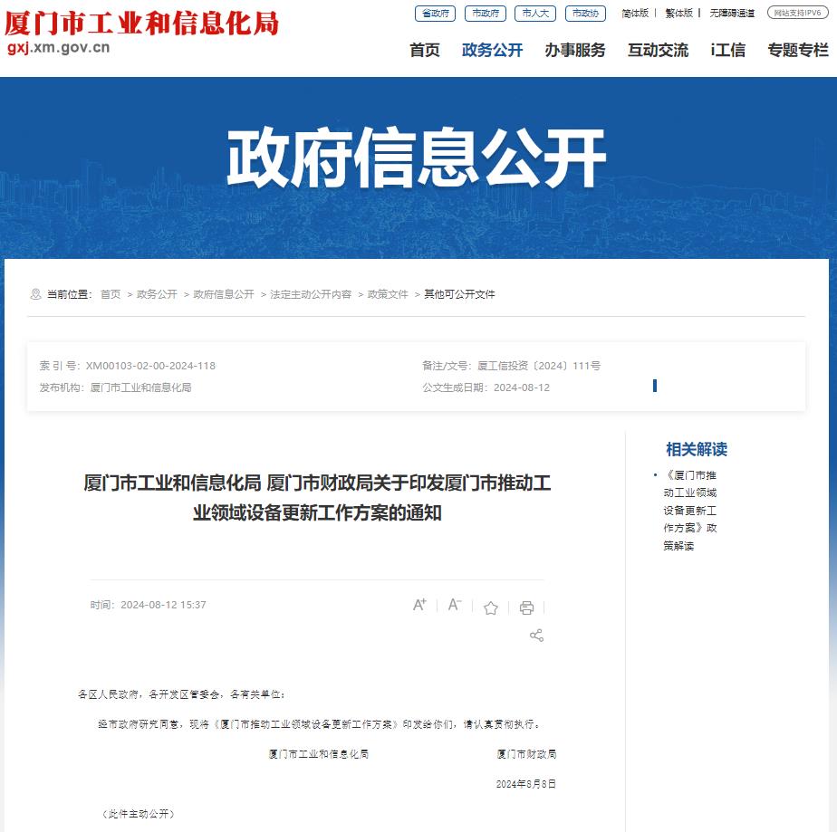 厦门日报讯(记者 李晓平)昨日,市工信局和市财政局联合印发《厦门市推动工业领域设备更新工作方案》(以下简称《方案》),聚焦机械装备、电子信息、生物医药和新材料四个行业,通过推动全流程各环节数字化转型、绿色设备推广应用、先进适用安全装备应用、优势产品供给能力提升,自上而下促进厦门工业领域设备更新,做强做大支柱和战略新兴产业。