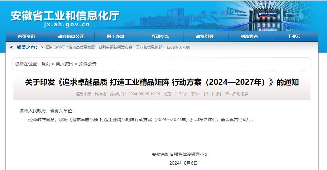 安徽省制造强省建设领导小组近日印发《追求卓越品质