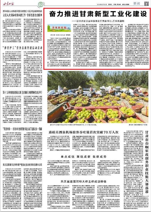 “党的二十届三中全会强调,要加快推进新型工业化。甘肃作为全国重要的老工业基地,必须紧紧围绕强龙头、补链条、聚集群,紧扣资源禀赋和产业基础,抢抓进一步全面深化改革的历史机遇,以科技创新引领产业创新,持续推进石油化工、有色冶金等传统产业转型升级,大力发展新能源、新材料、生物医药、数据信息等新兴产业,谋划布局氢能、新型储能、航空航天、重离子装备等未来产业,推动新型工业化取得更大进展和成效。”近日,省工信厅党组书记、厅长韩显明在接受甘肃日报记者专访时表示。
