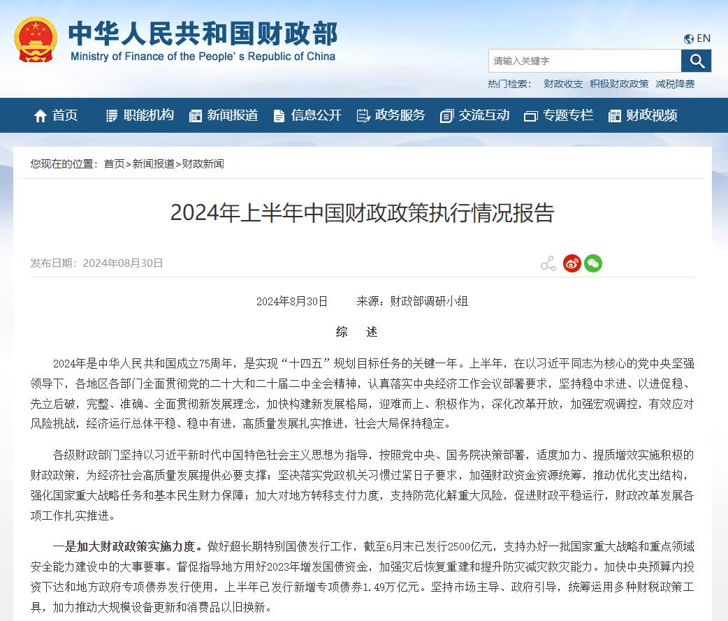 下一步,财政部门将深入学习贯彻党的二十届三中全会精神,按照党中央决策部署,完整、准确、全面贯彻新发展理念,坚持稳中求进工作总基调,深化财税体制改革,加大财政宏观调控力度,强化财政科学管理,加强财政政策与其他政策协调配合,提升政策实施效能,推动增强经济回升向好态势。