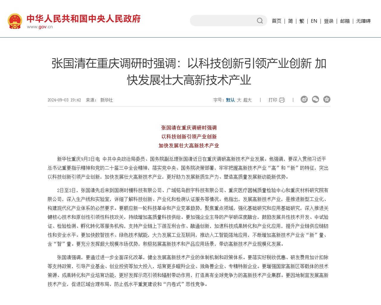 中共中央政治局委员、国务院副总理张国清近日在重庆调研高新技术产业发展。他强调,要深入贯彻习近平总书记重要指示精神和党的二十届三中全会精神,落实党中央、国务院决策部署,牢牢把握高新技术产业“高”和“新”的特征,突出以科技创新引领产业创新,加快发展壮大高新技术产业,更好助力发展新质生产力、塑造高质量发展新动能新优势。