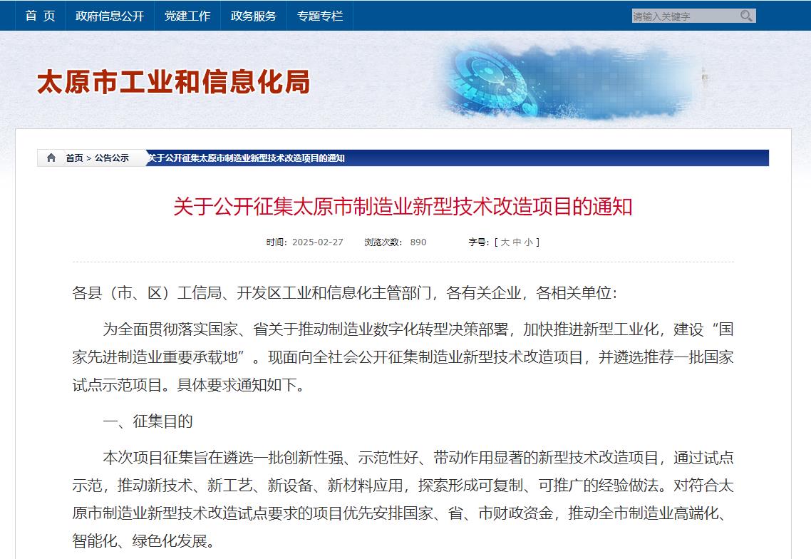 为加快推进新型工业化,建设“国家先进制造业重要承载地”,太原市工信局现在开始征集制造业新型技术改造项目,并遴选推荐一批国家试点示范项目。对符合太原市制造业新型技术改造试点要求的项目优先安排国家、省、市财政资金,推动全市制造业高端化、智能化、绿色化发展。
