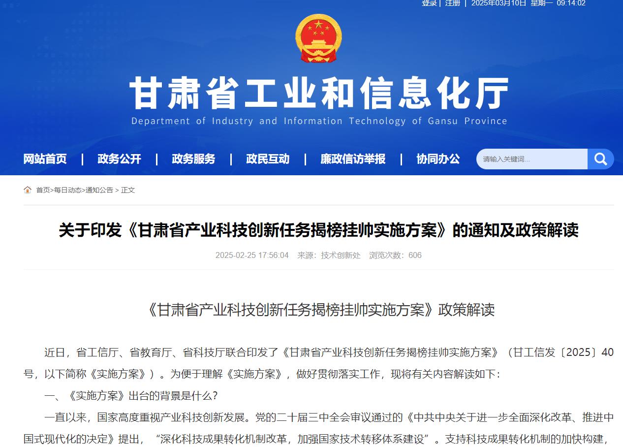 近日,甘肃省工信厅、省教育厅、省科技厅联合印发了《甘肃省产业科技创新任务揭榜挂帅实施方案》,将聚焦我省冶金有色、能源化工、电子信息、智能装备、新材料、生物医药、航空航天、循环经济等重点领域,征集遴选一批补短板产品和关键核心技术,组织具备较强创新能力的企业揭榜攻关,促进制造业高质量发展。
