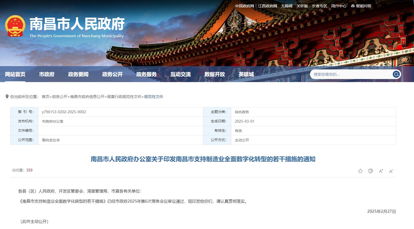 南昌市政府办公室近日印发《南昌市支持制造业全面数字化转型的若干措施》,自今年3月29日起施行,有效期至今年12月31日。