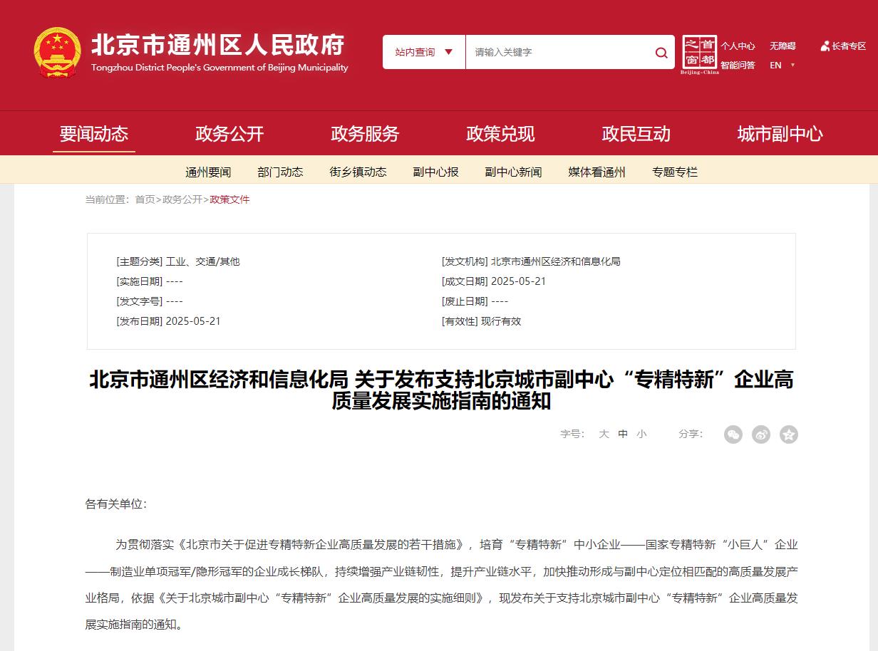 5月21日,北京市通州区经信局发布了《关于发布支持北京城市副中心“专精特新”企业高质量发展实施指南的通知》。相关单位这次获得了八大支持鼓励方向,最高可获支持300万元。