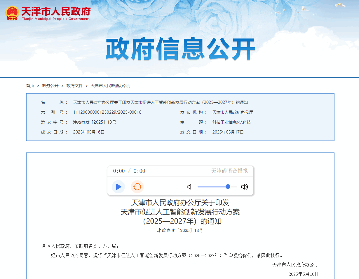 附件:《天津市人民政府办公厅关于印发天津市促进人工智能创新发展行动方案(2025—2027年)的通知》全文下载