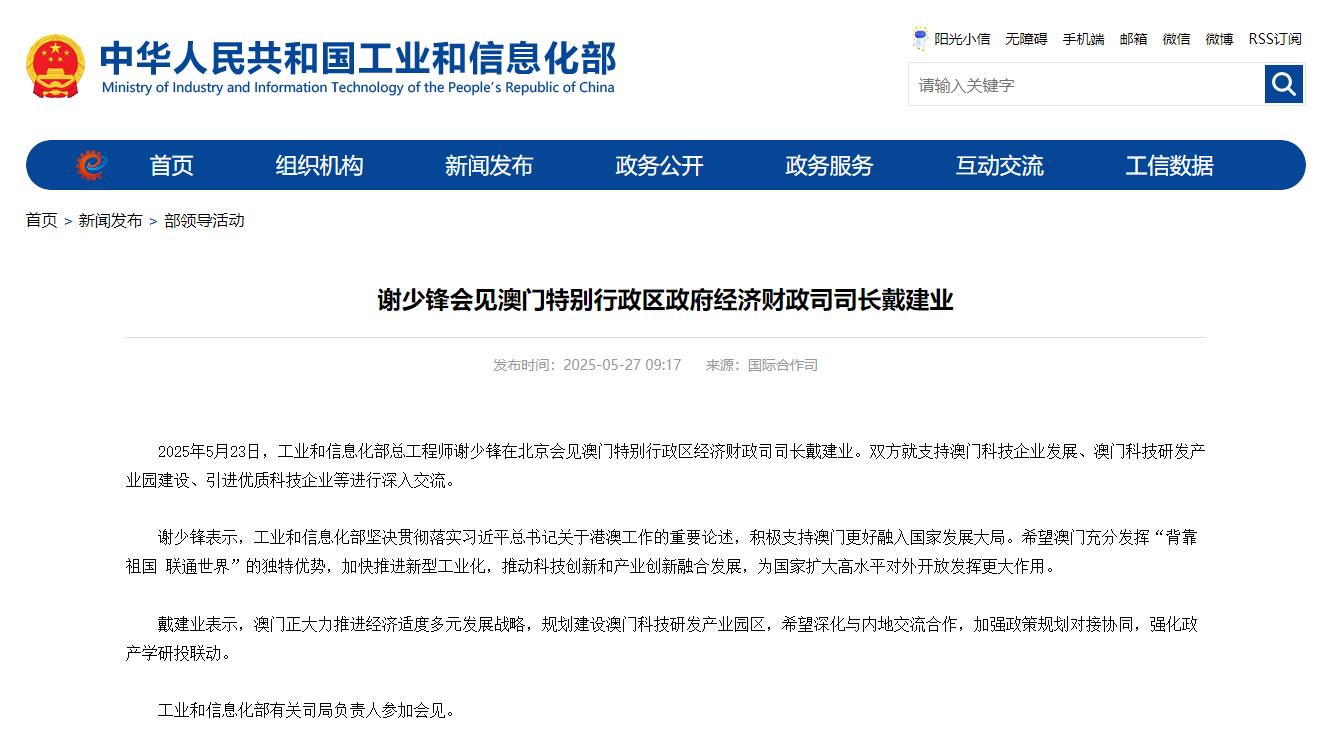 2025年5月23日,工业和信息化部总工程师谢少锋在北京会见澳门特别行政区经济财政司司长戴建业。双方就支持澳门科技企业发展、澳门科技研发产业园建设、引进优质科技企业等进行深入交流。