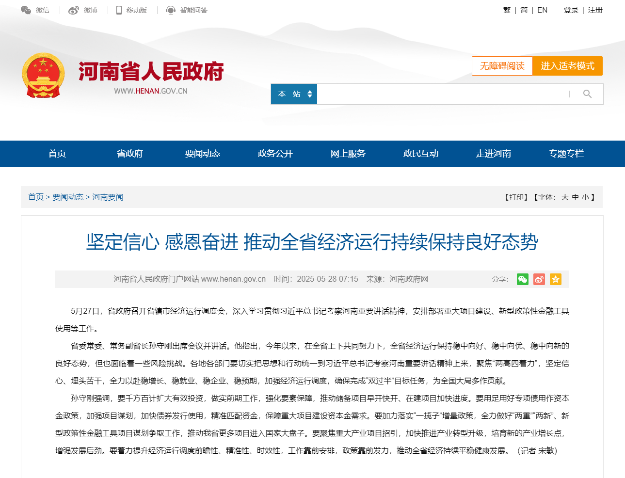 省委常委、常务副省长孙守刚出席会议并讲话。他指出,今年以来,在全省上下共同努力下,全省经济运行保持稳中向好、稳中向优、稳中向新的良好态势,但也面临着一些风险挑战。各地各部门要切实把思想和行动统一到习近平总书记考察河南重要讲话精神上来,聚焦“两高四着力”,坚定信心、埋头苦干,全力以赴稳增长、稳就业、稳企业、稳预期,加强经济运行调度,确保完成“双过半”目标任务,为全国大局多作贡献。