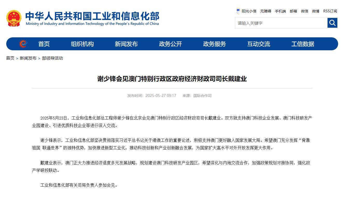 2025年5月23日,工业和信息化部总工程师谢少锋在北京会见澳门特别行政区经济财政司司长戴建业。双方就支持澳门科技企业发展、澳门科技研发产业园建设、引进优质科技企业等进行深入交流。