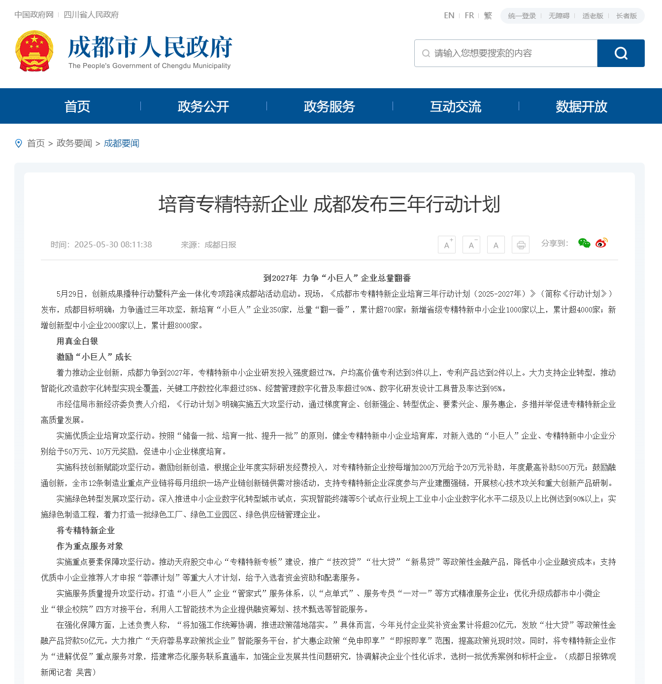 5月29日,创新成果播种行动暨科产金一体化专项路演成都站活动启动。现场,《成都市专精特新企业培育三年行动计划(2025-2027年)》(简称《行动计划》)发布,成都目标明确:力争通过三年攻坚,新培育“小巨人”企业350家,总量“翻一番”,累计超700家 新增省级专精特新中小企业1000家以上,累计超4000家 新增创新型中小企业2000家以上,累计超8000家。