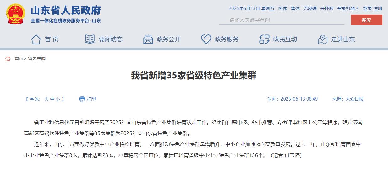 山东省工业和信息化厅日前组织开展了2025年度山东省特色产业集群培育认定工作。经集群自愿申报、各市推荐、专家评审和网上公示等程序,确定济南高新区高端软件特色产业集群等35家集群为2025年度山东省特色产业集群。