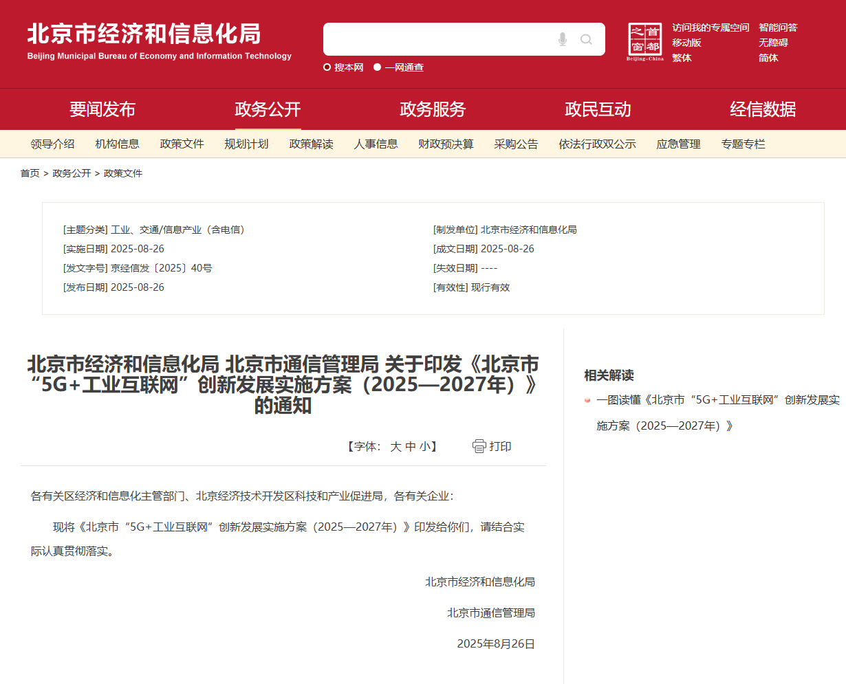 为深入推进5G与工业互联网的融合创新发展,更好赋能北京制造业转型升级,加快推进新型工业化、发展新质生产力提供坚实支撑,特制定本方案。力争到2027年,建设5G行业专网总数不少于50个,累计打造5G工厂不少于20家,培育综合性、行业性5G应用解决方案供应商不少于50家。
