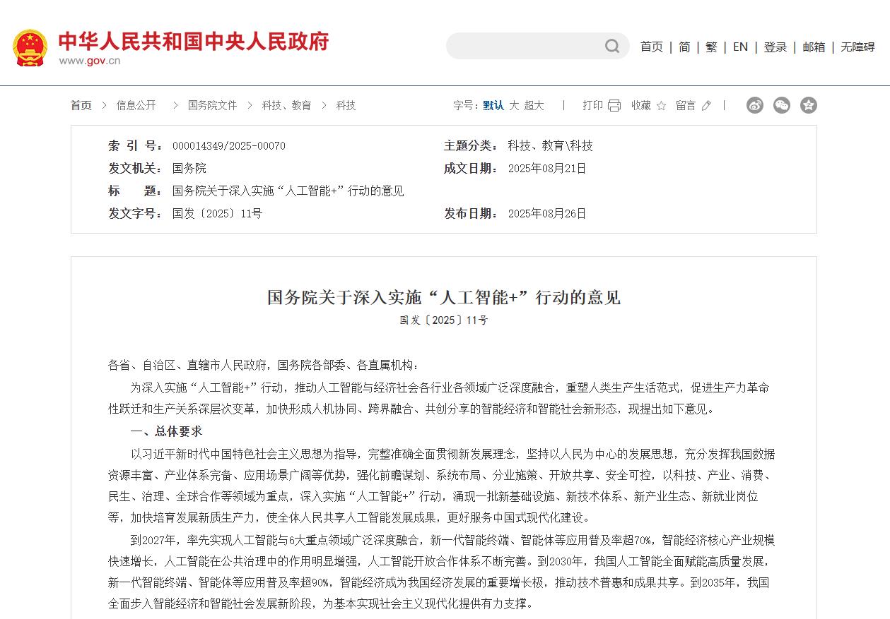 国务院日前印发《关于深入实施“人工智能+”行动的意见》(以下简称《意见》)。