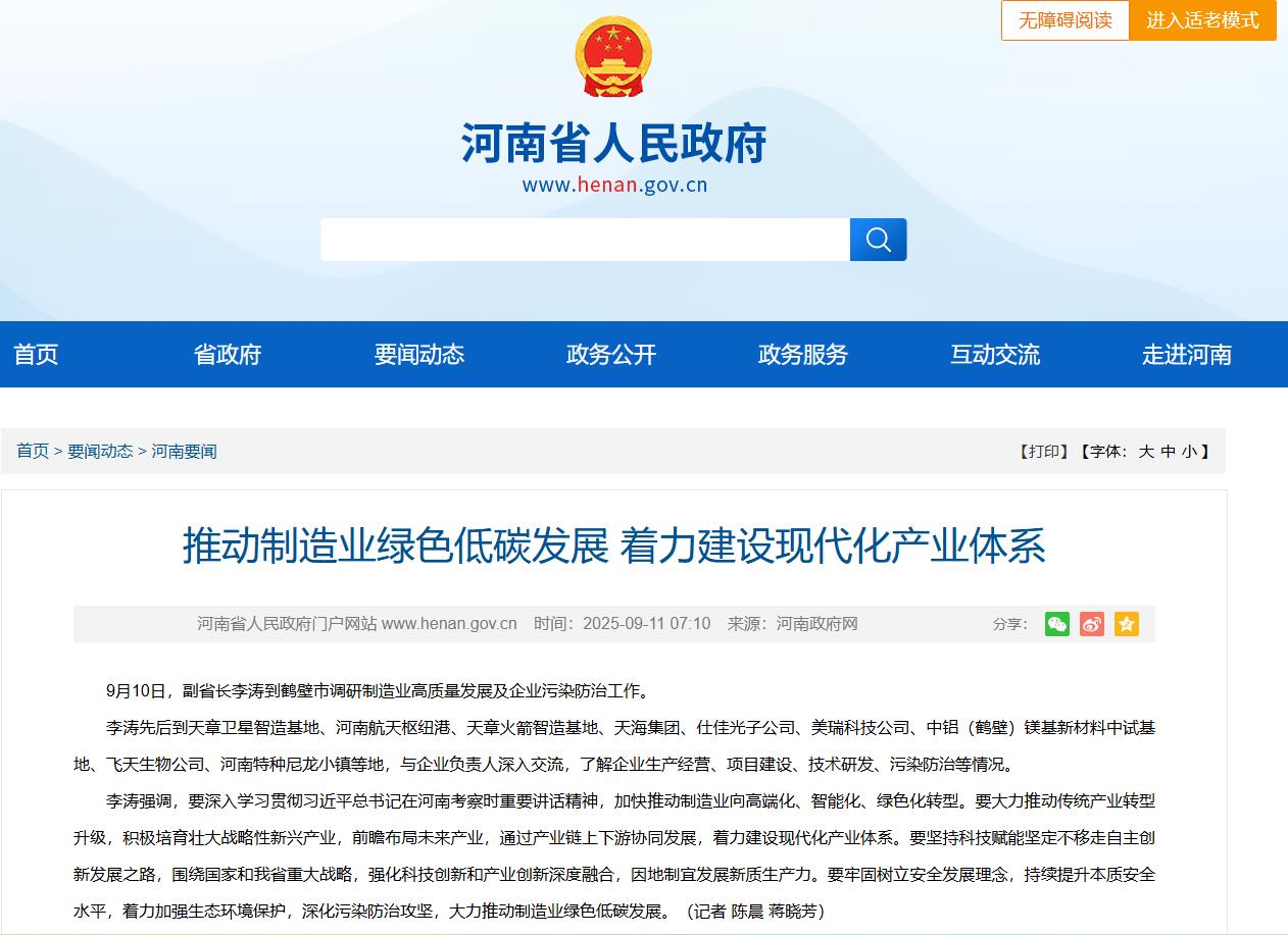 9月10日,河南副省长李涛到鹤壁市调研制造业高质量发展及企业污染防治工作。