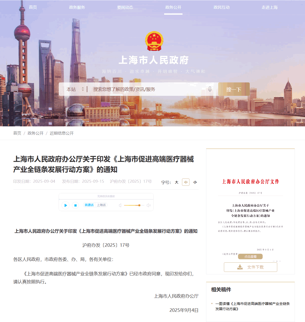 9月15日,上海市政府办公厅印发的《上海市促进高端医疗器械产业全链条发展行动方案》上网公开。《行动方案》围绕创新策源、临床赋能、审评审批、入院应用、企业培育、产业生态、国际化发展等7个方面,部署20项重点任务。在创新产品、龙头企业、产业布局三个方向,《行动方案》提出发展目标:力争到2027年,新增首次获批境内第三类医疗器械注册证超500件,新增在海外市场获批医疗器械产品超100件 培育2家年产值超100亿元的具有较强国际竞争力的龙头企业 建设浦东、闵行、嘉定三大高端医疗器械产业集聚区。