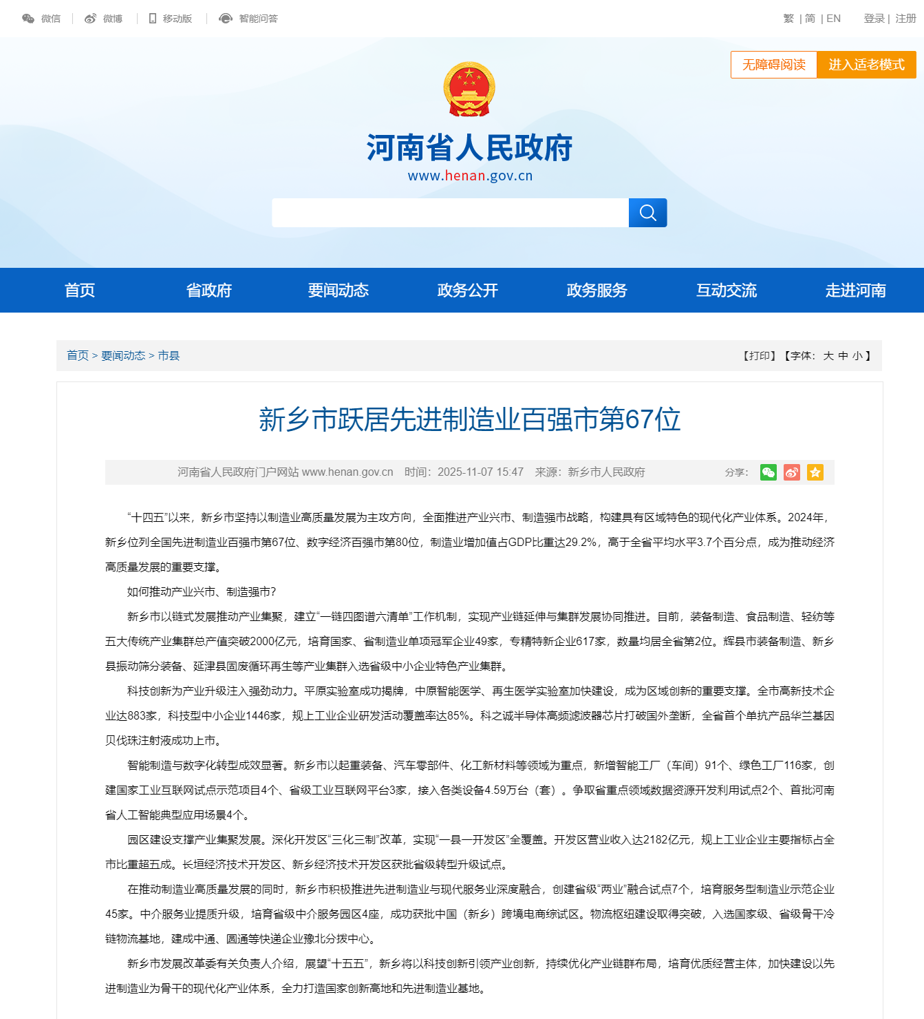 “十四五”以来,新乡市坚持以制造业高质量发展为主攻方向,全面推进产业兴市、制造强市战略,构建具有区域特色的现代化产业体系。2024年,新乡位列全国先进制造业百强市第67位、数字经济百强市第80位,制造业增加值占GDP比重达29.2%,高于全省平均水平3.7个百分点,成为推动经济高质量发展的重要支撑。