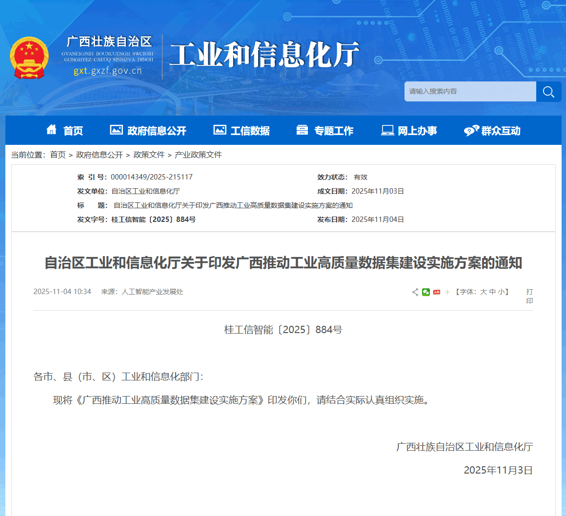 近日,广西壮族自治区工业和信息化厅印发《广西推动工业高质量数据集建设实施方案》。未来三年,我区将通过梳理数据集应用需求、汇聚高质量数据、分级构建高质量数据集、分类开发数据产品、推动工业数据流通交易、加强工业数据集生态建设等六大重点任务,全面提升工业数据开发开放和流通使用水平。力争到2028年,建成工业高质量数据集100个,应用数据集打造一批行业模型,打造标杆应用场景100个以上,培育一批数据服务企业,建设数据标注和合成基地10个,基本建成创新驱动、流通高效、面向东盟、安全合规的工业数据产业生态体系。