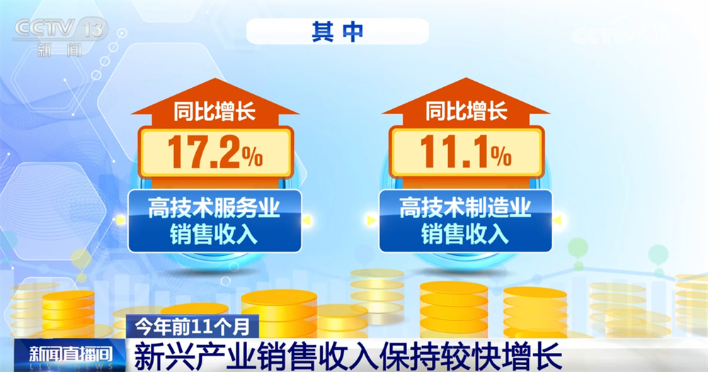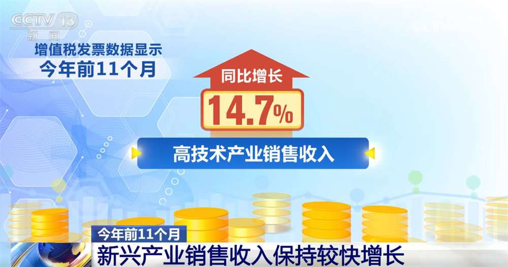 今年以来,我国新兴产业持续培育壮大,为经济发展持续注入新活力新动能。国家税务总局发布的最新数据显示,今年前11个月,高技术产业、数字经济核心产业销售收入均保持两位数以上增长。
