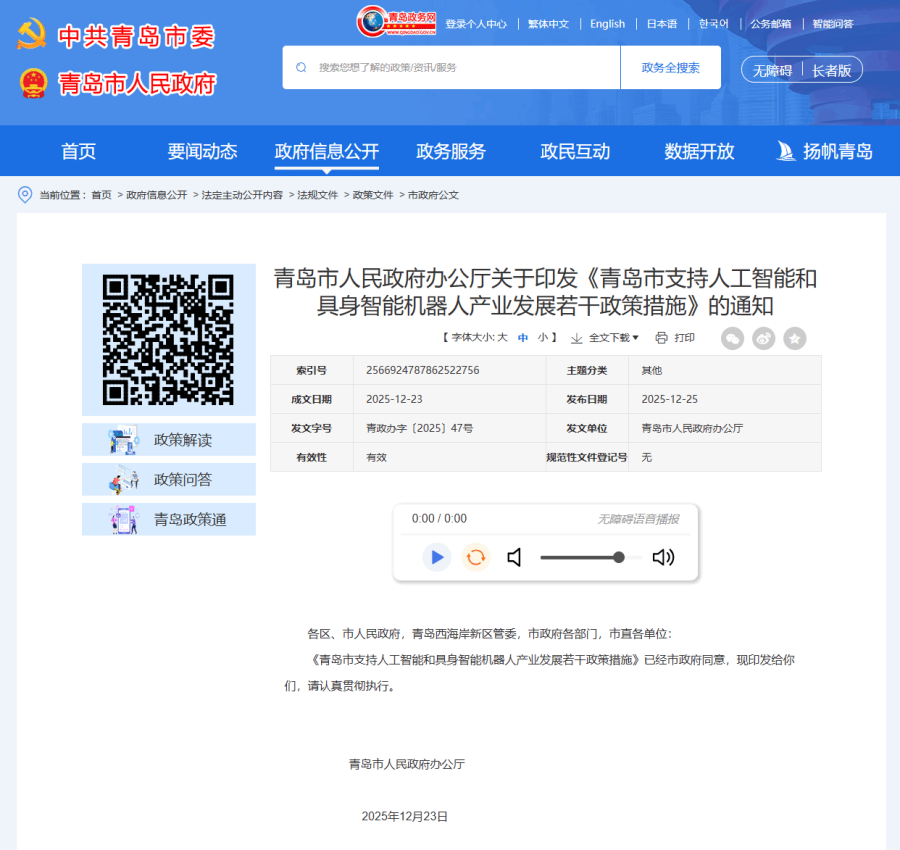 《青岛市支持人工智能和具身智能机器人产业发展若干政策措施》近日由青岛市政府办公厅印发。政策措施共12条,系统性强、集成度高,设置了从核心要素、赋能应用、产业生态、资源保障等“一揽子”支持措施,为企业提供从落地孵化到培育壮大全方位保障。