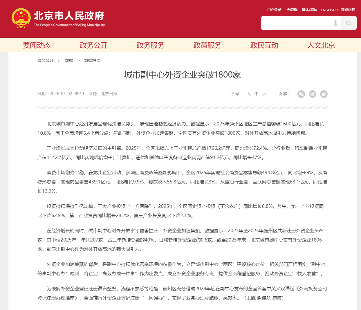在经济增长的同时,城市副中心对外开放水平显著提升,外资企业加速集聚。数据显示,2023年至2025年通州区共新注册外资企业569家,其中仅2025年一年达207家,占三年新增总数的40%,日均新增外资企业约0.6家。截至2025年末,北京城市副中心实有外资企业1806家,彰显出副中心作为对外开放高地的强大吸引力。