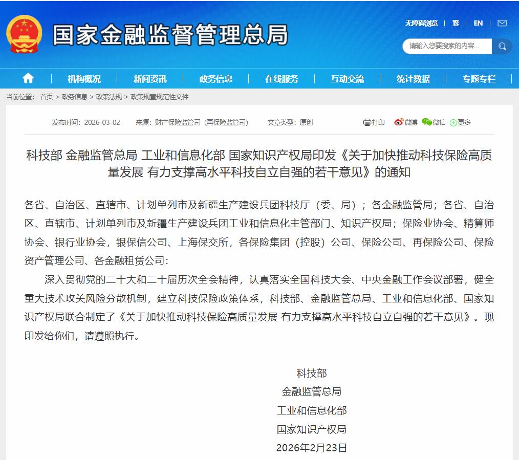 金融监管总局3月2日消息,科技部、金融监管总局、工业和信息化部、国家知识产权局近日联合印发《关于加快推动科技保险高质量发展有力支撑高水平科技自立自强的若干意见》(下称《意见》)。