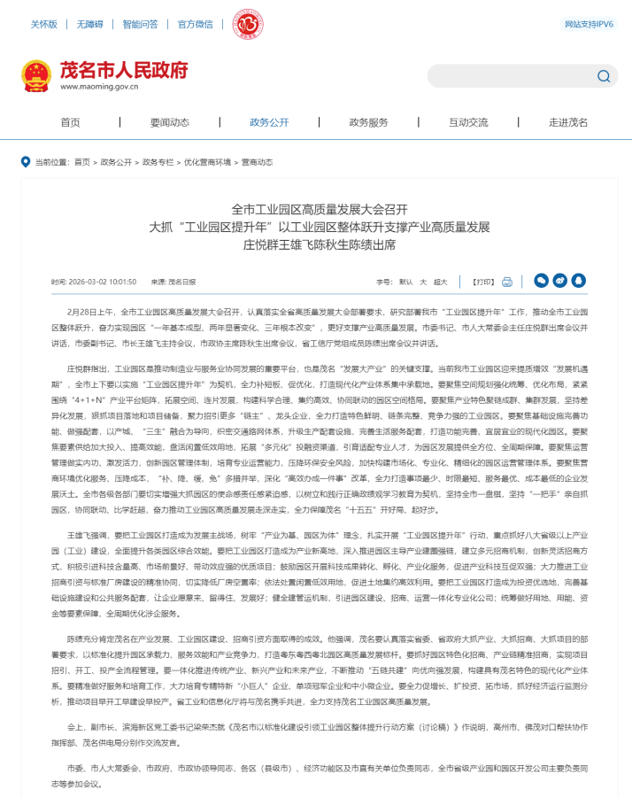 庄悦群指出,工业园区是推动制造业与服务业协同发展的重要平台,也是茂名“发展大产业”的关键支撑。当前茂名市工业园区迎来提质增效“发展机遇期”,全市上下要以实施“工业园区提升年”为契机,全力补短板、促优化,打造现代化产业体系集中承载地。要聚焦空间规划强化统筹、优化布局,紧紧围绕“4+ 1+N”产业平台矩阵,拓展空间、连片发展,构建科学合理、集约高效、协同联动的园区空间格局。要聚焦产业特色聚链成群、集群发展,坚持差异化发展,狠抓项目落地和项目储备,聚力招引更多“链主”、龙头企业,全力打造特色鲜明、链条完整、竞争力强的工业园区。要聚焦基础设施完善功能、做强配套,以产城、“三生”融合为导向,织密交通路网体系,升级生产配套设施,完善生活服务配套,打造功能完善、宜居宜业的现代化园区。要聚焦要素供给加大投入、提高效能,盘活闲置低效用地,拓展“多元化”投融资渠道,引育适配专业人才,为园区发展提供全方位、全周期保障。要聚焦运营管理做实内功、激发活力,创新园区管理体制,培育专业运营能力,压降环保安全风险,加快构建市场化、专业化、精细化的园区运营管理体系。要聚焦营商环境优化服务、压降成本,“补、降、缓、免”多措并举,深化“高效办成一件事”改革,全力打造事项最少、时限最短、服务最优、成本最低的企业发展沃土。全市各级各部门要切实增强大抓园区的使命感责任感紧迫感,以树立和践行正确政绩观学习教育为契机,坚持全市一盘棋,坚持“一把手”亲自抓园区,协同联动、比学赶超,奋力推动工业园区高质量发展走深走实,全力保障茂名“十五五”开好局、起好步。