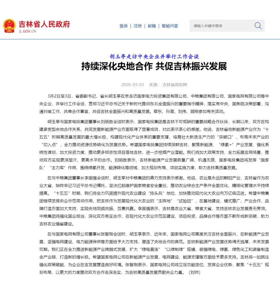 在与国家电网有限公司董事长张智刚会谈时,胡玉亭表示,近年来,国家电网公司高度关注吉林全面振兴,在新能源产业发展、坚强电网建设、电力能源保供等方面给予大力支持,塑造了央地合作的典范。吉林新能源产业发展优势得天独厚、未来发展可期。我们正在全力推进新能源产业跨越式发展,扩大“绿电直连”“以绿制绿”规模,做强绿电、绿氢、绿色化工和装备制造全产业链,打造新的增长极。希望国家电网公司在新能源产业发展、电网建设、能源支撑等方面给予更多支持。吉林将一如既往强化政策赋能,为企业在吉发展营造良好环境。张智刚表示,国家电网公司将立足功能定位、发挥企业优势,聚焦“十五五”规划布局,以更大的力度推动双方合作走深走实,为吉林高质量发展贡献央企力量。