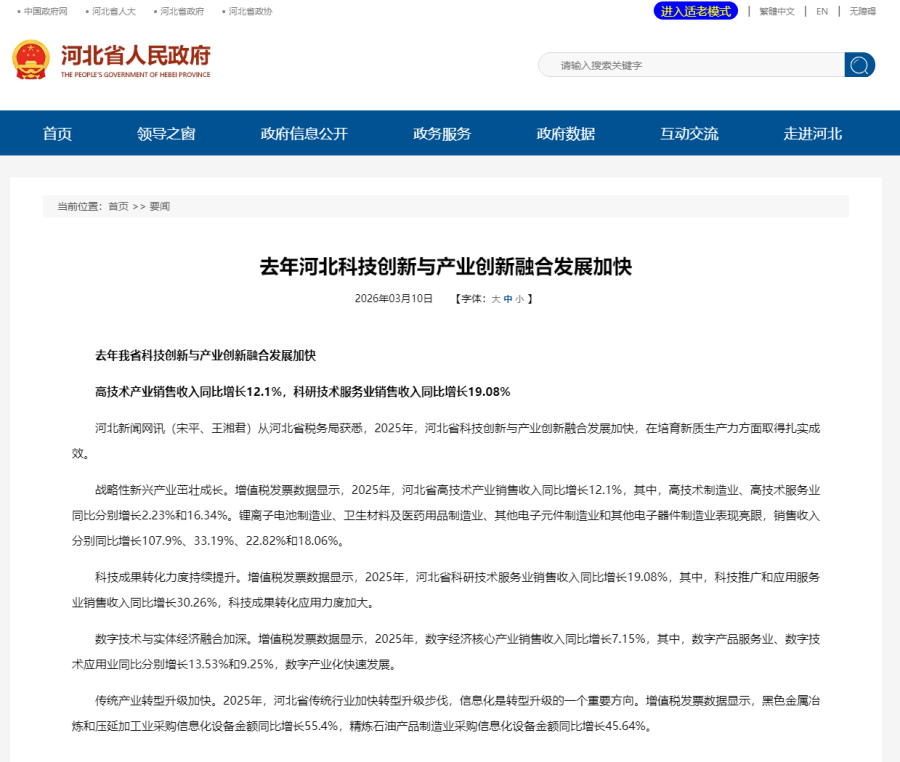 科技成果转化力度持续提升。增值税发票数据显示,2025年,河北省科研技术服务业销售收入同比增长19.08%,其中,科技推广和应用服务业销售收入同比增长30.26%,科技成果转化应用力度加大。