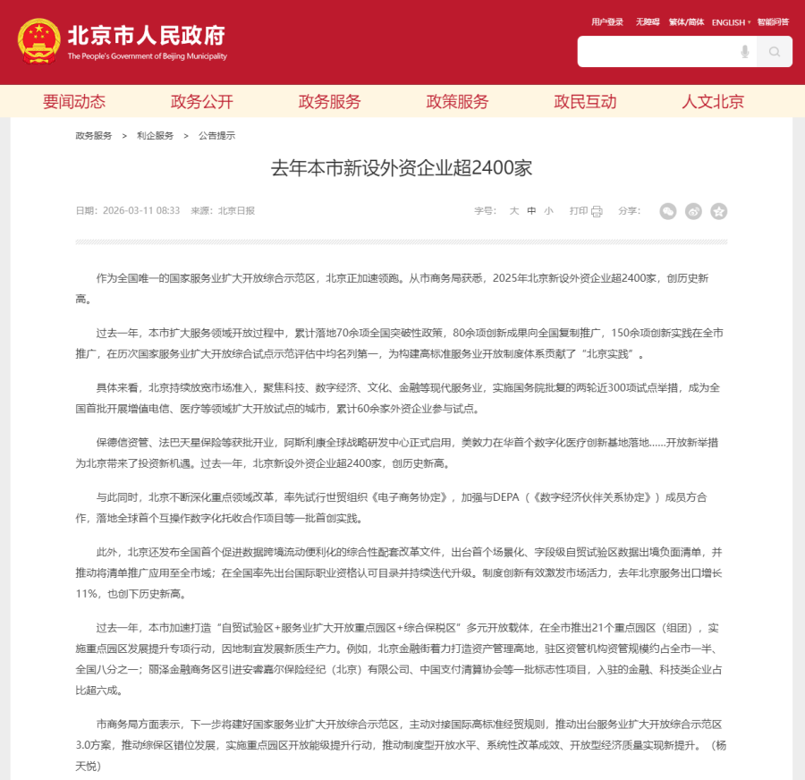 作为全国唯一的国家服务业扩大开放综合示范区,北京正加速领跑。从市商务局获悉,2025年北京新设外资企业超2400家,创历史新高。