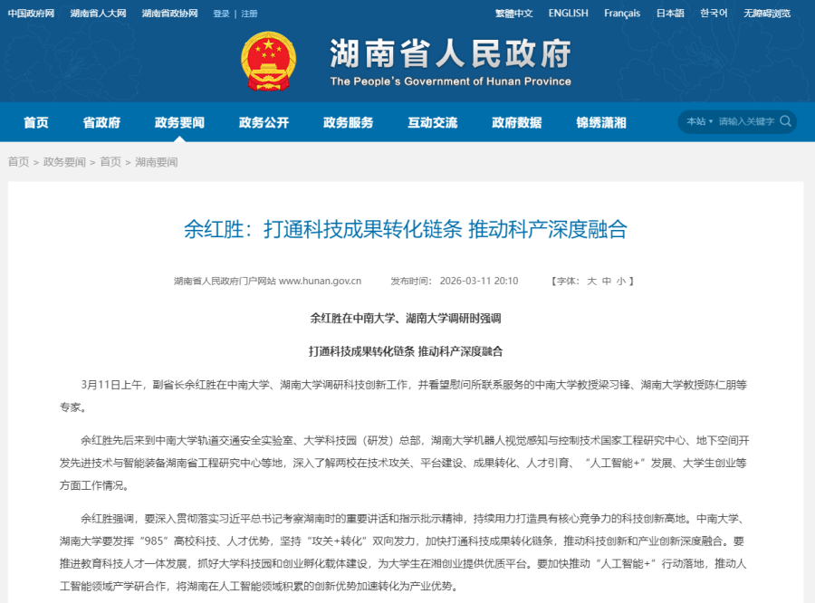 余红胜强调,要深入贯彻落实习近平总书记考察湖南时的重要讲话和指示批示精神,持续用力打造具有核心竞争力的科技创新高地。中南大学、湖南大学要发挥“985”高校科技、人才优势,坚持“攻关+转化”双向发力,加快打通科技成果转化链条,推动科技创新和产业创新深度融合。要推进教育科技人才一体发展,抓好大学科技园和创业孵化载体建设,为大学生在湘创业提供优质平台。要加快推动“人工智能+”行动落地,推动人工智能领域产学研合作,将湖南在人工智能领域积累的创新优势加速转化为产业优势。