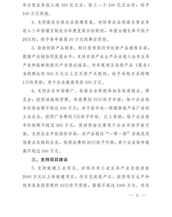 支持新建工业项目。对郑州市工业主导产业总投资在2000万元以上的新建项目,项目完成投产后,按照项目生产和技术设备投资额的10%给予奖励,最高不超过1000万元。