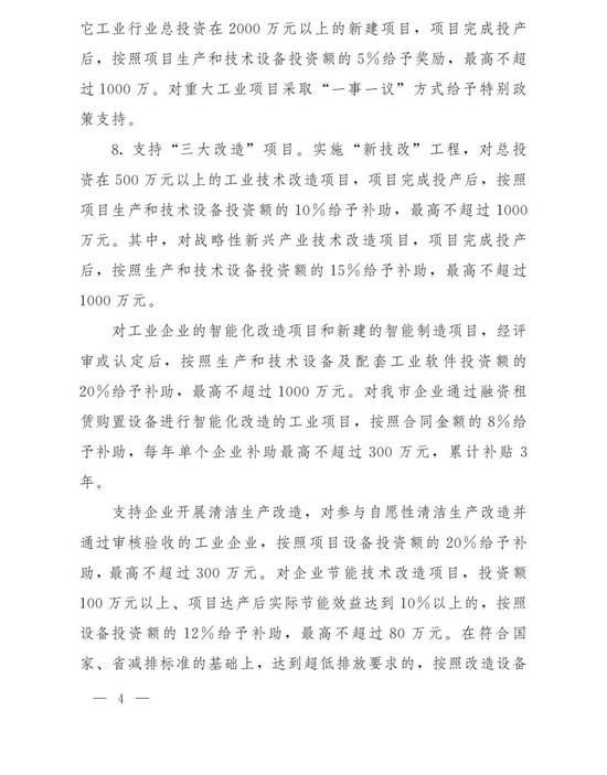支持“三大改造”项目。实施“新技改”工程,对总投资在500万元以上的工业技术改造项目,项目完成投产后,按照项目生产和技术设备投资额的10%给予补助,最高不超过1000万元。