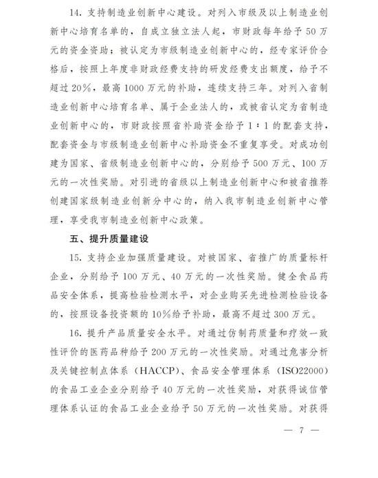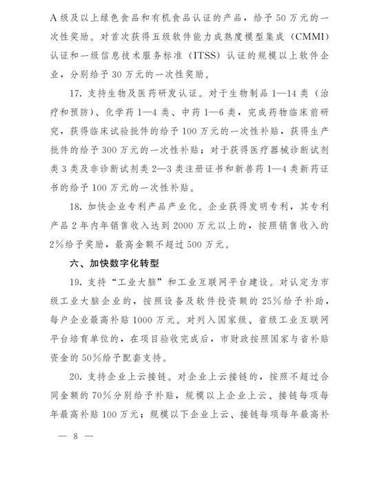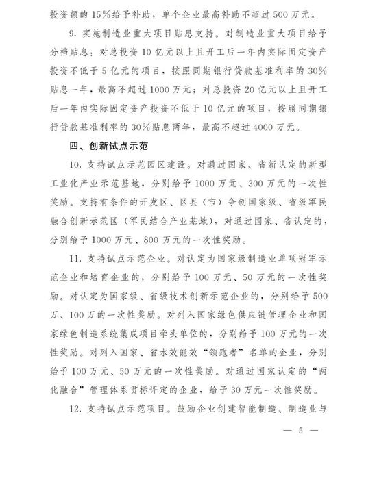 实施制造业重大项目贴息支持。对总投资20亿元以上且开工后一年内实际固定资产投资不低于10亿元的项目,按照同期银行贷款基准利率的30%贴息两年,最高不超过4000万元。