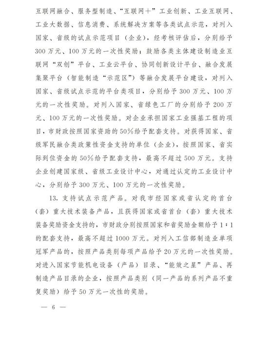 支持试点示范园区建设。对通过国家、省新认定的新型工业化产业示范基地,分别给予1000万元、300万元的一次性奖励。支持有条件的开发区、区县(市)争创国家级、省级军民融合创新示范区(军民结合产业基地),对通过国家、省认定的,分别给予1000万元、800万元的一次性奖励。