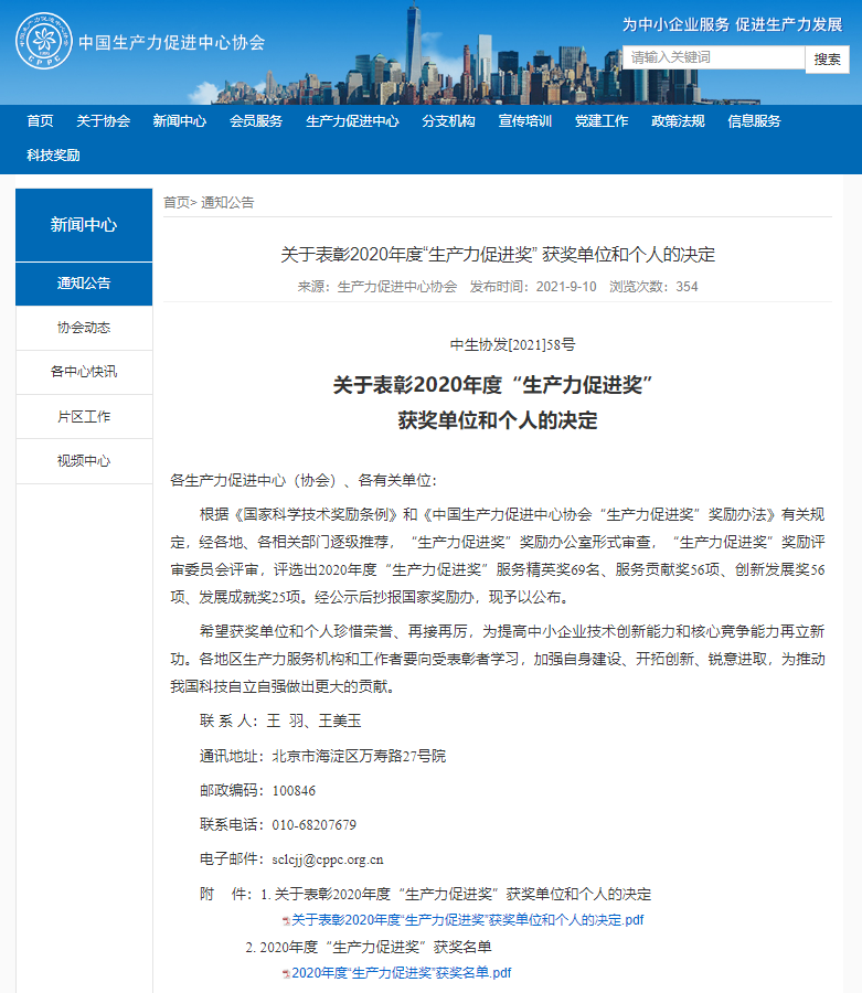 “生产力促进奖”是2003年由国家科技部和国家科学技术奖励办公室批准设立,是我国生产力促进、科技服务领域的国家级奖项,旨在对致力服务中小微企业技术创新、服务地方经济发展,为生产力促进事业发展做出突出贡献的集体进行表彰。