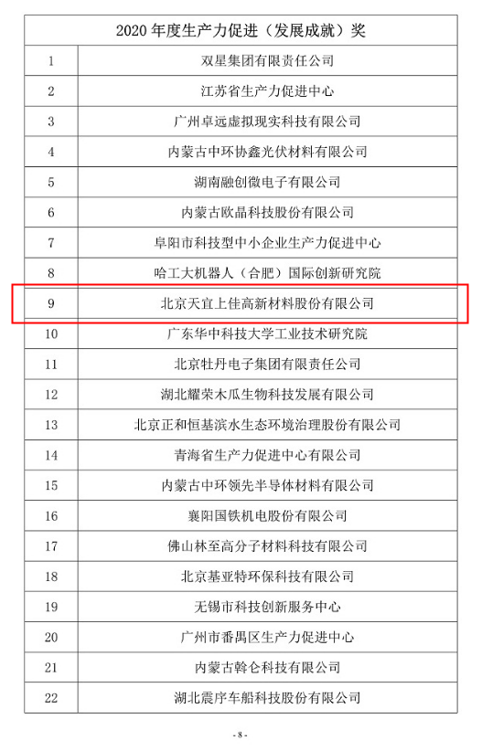 近日,中国生产力促进中心协会公布了“2020年度生产力促进奖”评选结果,经审查推荐、专家评审,北京天宜上佳高新材料股份有限公司(以下简称“天宜上佳”)荣获“2020年度生产力促进(发展成就)奖”。